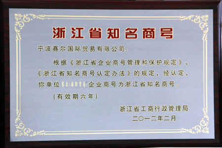 我司歷來注重品牌建設,堅持誠信經營,重視社會責任,“賽爾”商號已獲得廣泛的社會認同。獲得“浙江省知名商號”榮譽,不僅使我司相關權益得到了更堅實的保護,而且提升了企業形象、增強了企業的市場競爭實力。名列“浙江省知名商號”榜,對保護賽爾的知識產權、推進品牌建設、促進企業穩步發展都具有十分重要的意義。
