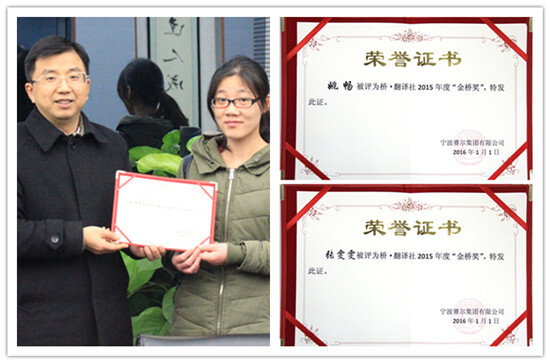 會(huì)議最后,為表彰張?chǎng)┖鸵硟晌簧鐔T在集團(tuán)外語(yǔ)培訓(xùn)上所作出的貢獻(xiàn),特向她們頒發(fā)了“金橋獎(jiǎng)”榮譽(yù)證書(shū),今后,“金橋獎(jiǎng)”將成為表彰翻譯社內(nèi)有突出貢獻(xiàn)社員的常設(shè)榮譽(yù)獎(jiǎng)項(xiàng)。