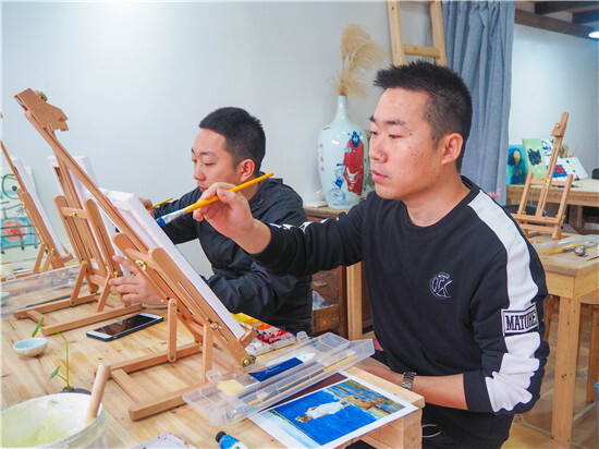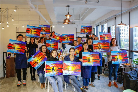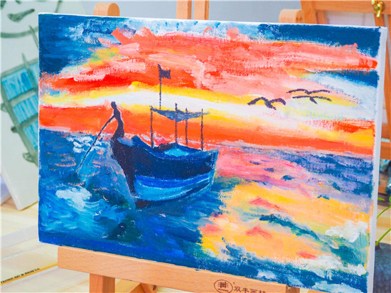 油畫一側,畫架擺上,顏料備好,圍裙一系,專業的畫師模樣出來了!男老師畫畫真的比較罕見,這細致活需要耐心。經過近2個小時的創作,一副副油畫作品出來了,寧波講師統一創作了“海上帆船”,沒有對比就沒有傷害哦。義烏講師就各顯神通了:有爸爸和媽媽和女兒一起創作的最紅社會人“小豬佩奇”;有自創作品“書香四溢”,出自桂東東老師之手,簡約卻不失神韻哦!