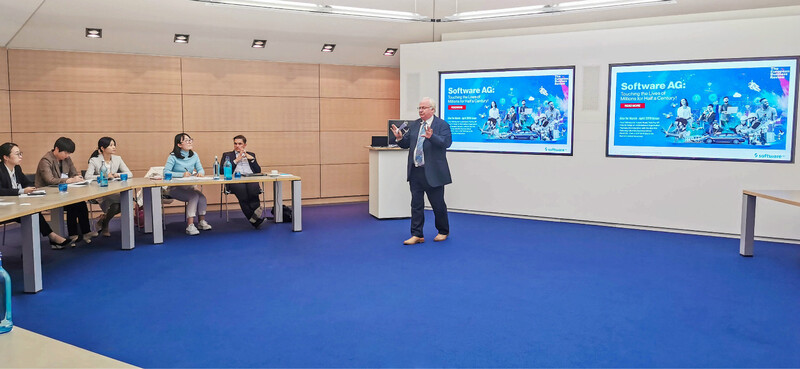 Software AG公司國際媒體事務總監Paul Hughes先生接待了游學團一行,他簡要介紹了公司發展史,Paul Hughes先生在SAG公司工作了28年,也讓團員們心生敬意。