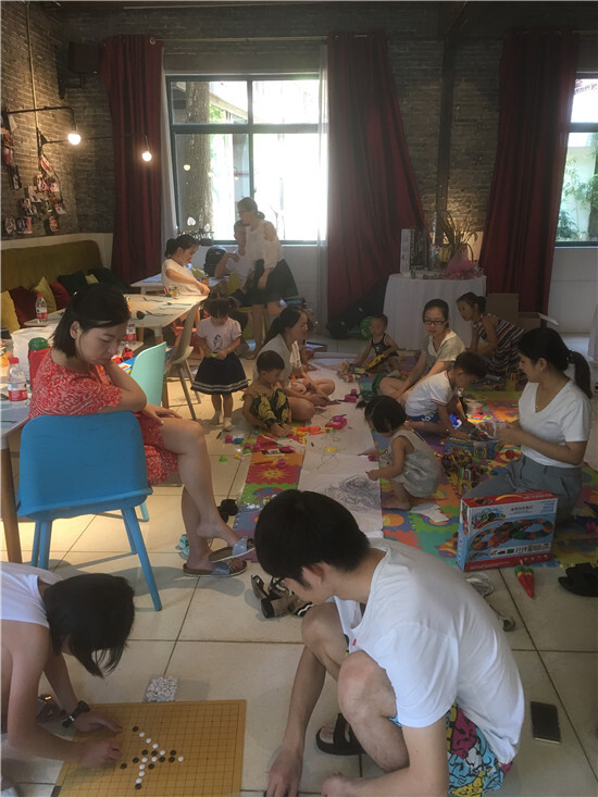 8月4日,天氣晴朗,優景公司第一屆親子活動在大步里院拉開了序幕。共有13組家庭報名參加,其中3-5歲的寶貝居多。早上9點半,大家陸續來到大步里院,孩子們一看見我們為他們精心準備的畫板、水彩筆、印章等玩具,都迫不及待地脫掉鞋子,來到EVA墊子上,歡快地玩耍起來。