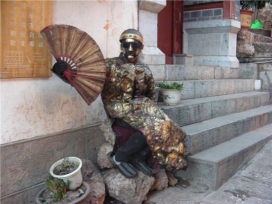 這其實是真人,打他身邊走過,會猛地一下打開折扇嚇你一跳