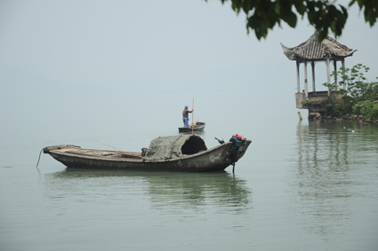 來一張遠景:破光粼粼的湖面上,一位老漁民深情地凝視著遠方。他在想什么?又是什么勾起了他的思緒?