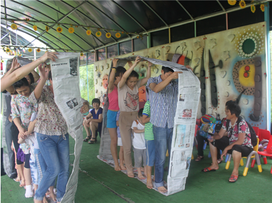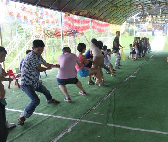 親子拔河比賽,把整個游戲推向高潮,各位辣爸靚媽們帶領(lǐng)自己的孩子使出渾身解數(shù),力圖把對方拉到自己的陣營,三局兩勝,我們的紅隊最后獲勝。