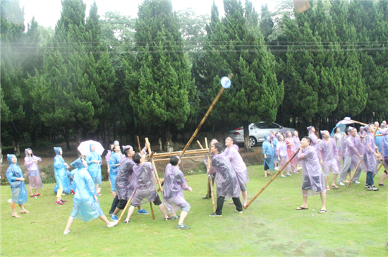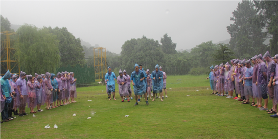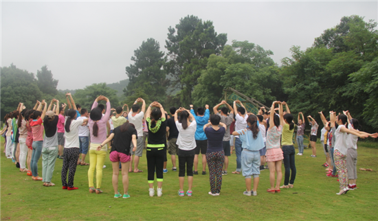 第二天早餐之后,我們100多號人在草地圍成2個同心圓,女生外圈,男生內圈。大家手拉手站立,在教練的帶領下開始熱身活動。