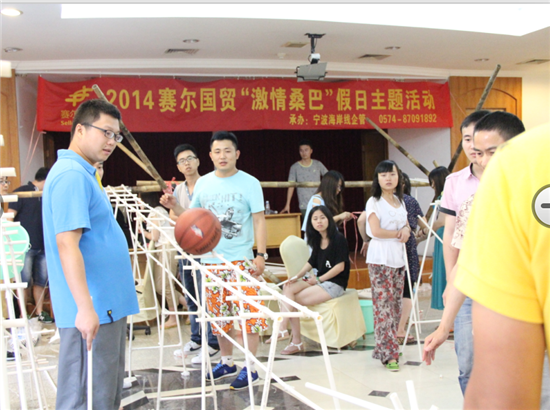 有的是不折不扣的實干家,蹲在地上認真地鋸管子,搭管子,加固,女生們配合著綁著繩子,還有的擔當宏觀大局的角色,幫忙看著整個構架的高低,然后不停的喊著“高一點,低一點”指揮著大家調整著高度,平衡度。分工有別,每個人在這個搭建的活動里找到了自己的角色,然后盡自己的能力去配合,去完成。當第一次籃球從我們親手扎起來的天橋上順利滾過的時候,那種喜悅無以言語。