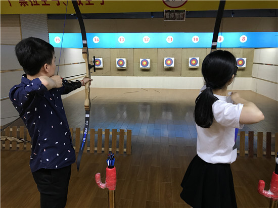 午餐過后,大家便來到了甬道順豐射箭館,體驗射箭的樂趣。在經過教練簡單的輔導之后,小伙伴們一個個有板有眼地拉起了弓,瞄準靶子射箭。結果由于弓弦太緊,放箭的時候總是會手抖,導致箭常常射偏,有的正中靶心,也有的射到了墻上,最終Linda童鞋以其健壯的臂力拔得頭籌!