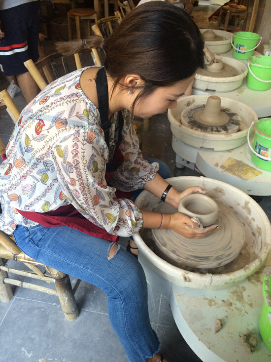 在很短的時(shí)間內(nèi),老師以最簡(jiǎn)單而專(zhuān)業(yè)的方式教我們?cè)谵D(zhuǎn)動(dòng)的拉坯機(jī)上制作個(gè)性實(shí)用器皿,如杯子,碗,花瓶,盤(pán)子等。接著,我們都放開(kāi)手腳開(kāi)始“創(chuàng)作”我們自己的陶藝作品。