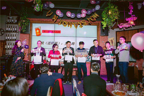 會議結(jié)束之后,大家陸續(xù)抵達龐客酒吧,酒過三巡,主持人錢青和周慧,步入舞臺中央,拉開了2017年優(yōu)景小年夜的帷幕。此次小年夜的主題是:奮斗路上,我們永遠十八!第一個節(jié)目是新人報道,2017年新進員工一一亮相作自我介紹,通過才藝展示和趣味游戲,讓大家對新同事有了更全面的了解。接下來的各色互動小游戲,讓臺下的同事笑得前仰后翻。
