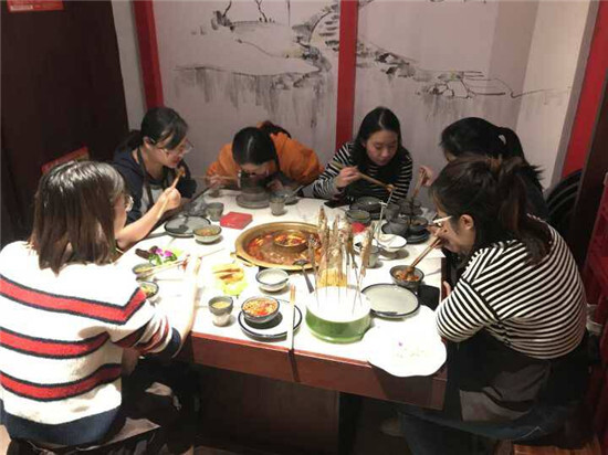 約定的當天下午出了一些小意外,小葉的貨急需返工,兩個組的姑涼們毫不猶豫地一起去倉庫幫忙。經過一番熱火朝天的努力后,全員終于在8點半集合來到義烏之心。疲憊和饑餓讓姑涼們都放下了矜持,大快朵頤,大家拉拉家常,聊聊八卦,笑聲不斷。
