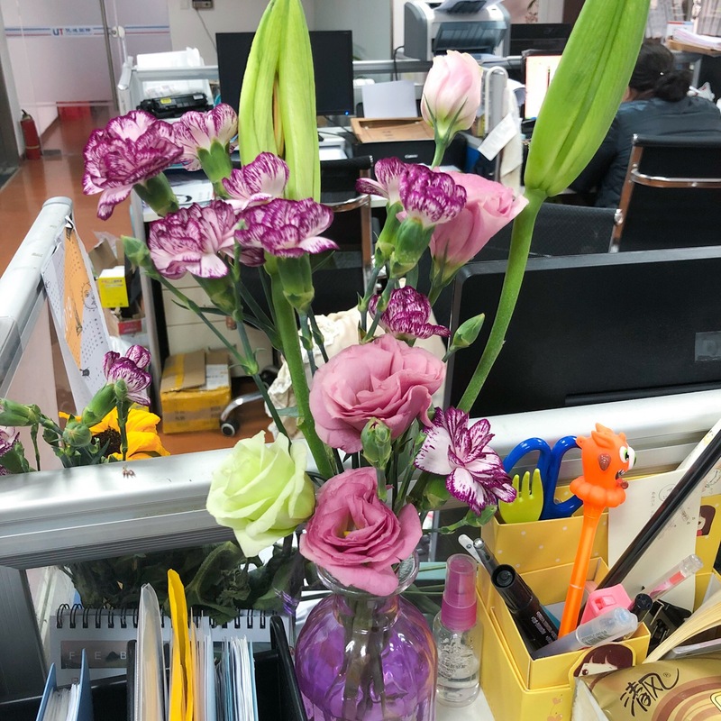 今年的女神節(jié),我們公司過得其實(shí)比往年要早。因?yàn)樵缭诠?jié)日前4天,我們的“后勤部長(zhǎng)”毛鈺雪同志就已經(jīng)為全公司采購(gòu)了真正的鮮花。從4天前的含苞待放到如今的花開正盛,辦公室已被鮮花包圍,看得人心情也美麗了起來。