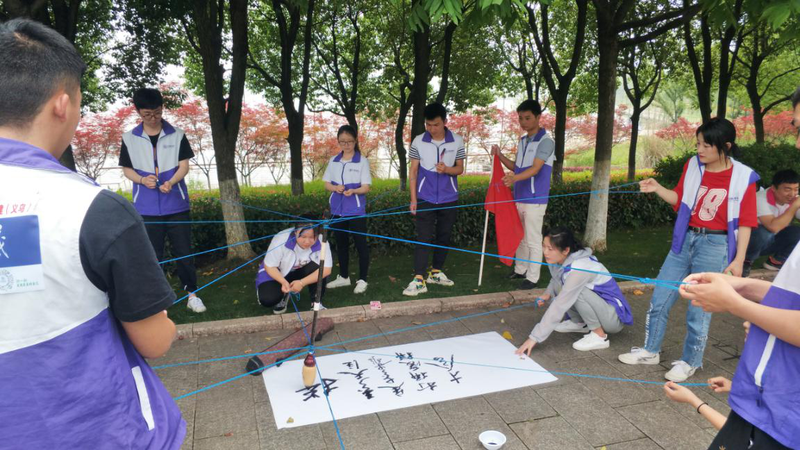 接下來就是正式開始的拓展游戲——團隊用毛筆書寫字幅,該項游戲考驗團隊隊員的組織協調力和耐心。數10根繩條只要有一個隊員分心,整個書寫行動便難以行進。三組隊員的認真協作獲得了拓展教練的一致好評。