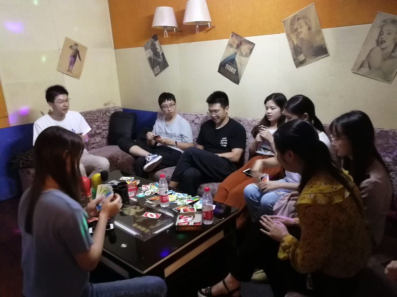 17日上午10點,大家陸陸續續到達了團建的地點——鄞州鳳凰谷轟趴館。館內有很多休閑娛樂的設施,例如臺球、棋牌室、桌上足球、KTV和投影等等。剛開始大家互相都還有點拘謹,但是不一會兒大家就已經打成一片,玩游戲、唱歌、看綜藝,玩得不亦樂乎。