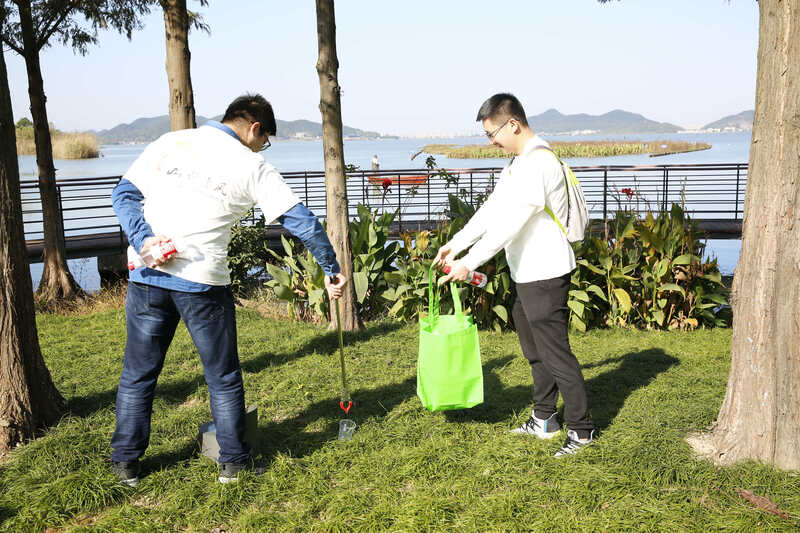 到了目的地,大家迅速分好組后開始繞東錢湖緩緩而行,在環(huán)保的同時(shí)我們有說有笑,也使得原本陌生的同事之間互相熟悉起來。水杯、塑料袋等垃圾在美麗的東錢湖草坪上顯得十分突兀,同事們兩人一組,拿著垃圾袋和夾子,一個(gè)個(gè)干得熱火朝天。雖然當(dāng)天的太陽很曬,但是每個(gè)人都堅(jiān)持把四周的垃圾撿得干干凈凈。