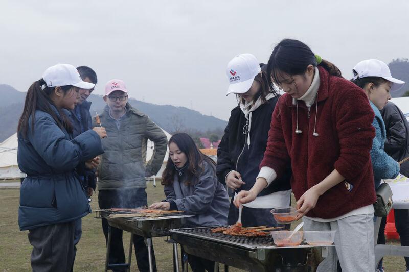 在山頂稍作休息后,我們轉(zhuǎn)戰(zhàn)了下一站目的地——花間樂園。五彩繽紛的風(fēng)車被有序的排滿在山坡上,風(fēng)一吹風(fēng)車也就隨風(fēng)擺動,頗有創(chuàng)意。我們租了帳篷和燒烤架,開始忙乎起來了。有的忙著燒烤,有的忙著包餃子,而一些人早已組局開始在帳篷里玩起游戲,或是圍坐著一起閑聊,舉杯暢飲。吃飽喝足以后,天氣也開始漸漸暗下來了,此次活動隨著黑夜的降臨落下帷幕。