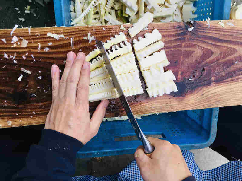 3月25日清晨,公司全員出動,分兩批陸續(xù)到達奉化毛岙村。300斤剛從竹林里運出來的新鮮筍兒,根部還帶著濕泥,在我們面前堆成一座小山。剝開殼,空氣中是一股清冽的筍香。因是第一次烤筍,姑娘們也沒少手滑,有一刀下去切了手的,有握刀久了磨出泡的,有曬瓶子結果把瓶子摔了的, 看來炊事技能堪憂。