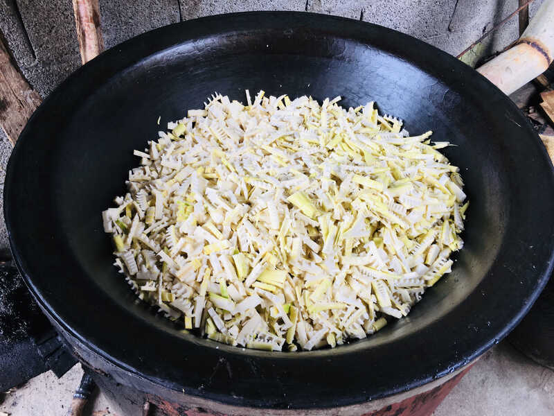 剝筍、洗筍、切筍完成后,就是燒筍的步驟了。拿出一口能裝下公司兩個苗條妹子的大鍋,將新鮮的筍悉數(shù)倒進燒制。其他配菜也是必不可少的:烤麻糍、烤玉米、烤地瓜……體會完童年的樂趣,嘴巴自然也不能閑著,大家你一口我一口,吃得不亦樂乎。