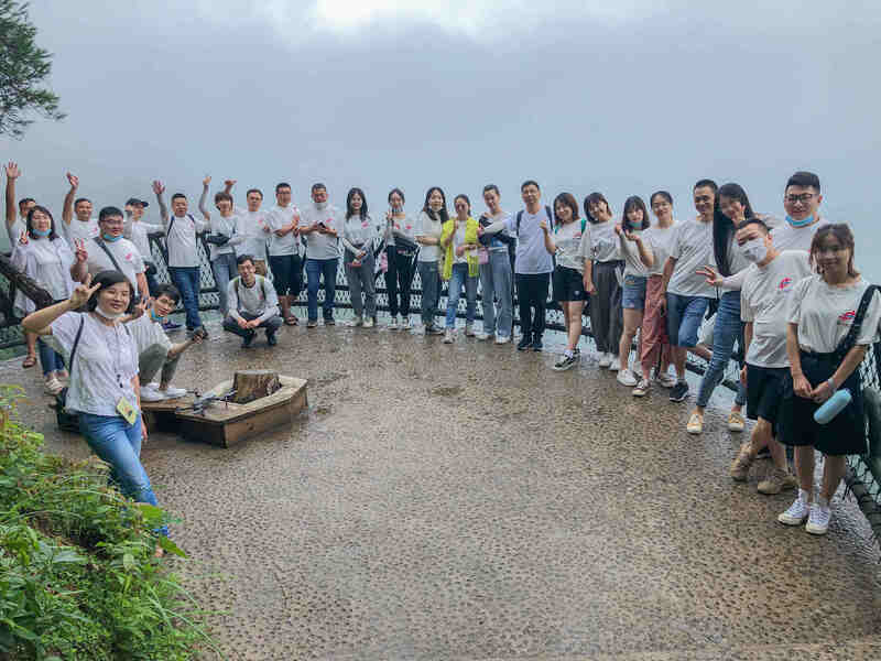 第二天一早,大家整理好裝備,向雪竇山頂端的徐鳧巖出發(fā)。凌云玻璃棧道沿絕壁而建,垂直高度兩百余米。大家各自施展凌波微步,順利完成玻璃棧道的挑戰(zhàn)。之后又進(jìn)行了集體跳繩、擊鼓傳花、狼人殺等拓展活動,在鼓掌和加油聲中,我們順利結(jié)束了此次團(tuán)建活動。