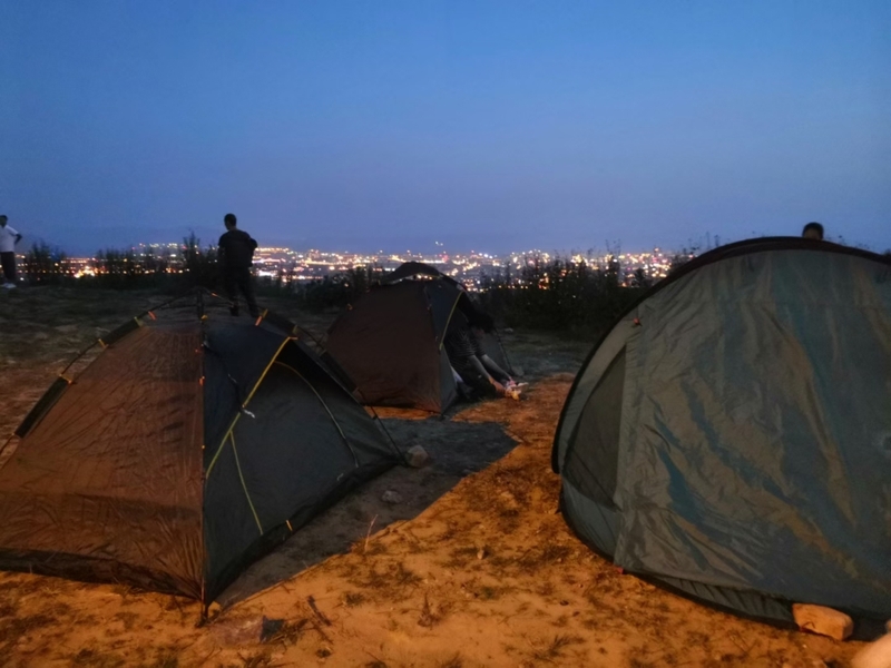 隨后, 我們出發(fā)前往第二站——金華山。到達目的地后,我們在視野寬廣、地面平坦的地方準備安營扎寨。趁著傍晚的夕陽還沒有完全落下,大家決定去大山中散步溜彎,我們邊走邊欣賞沿途的景色,時間仿佛在此刻靜止。夕陽西下,夜色悄然而至,DB小組團隊協(xié)作搭完帳篷后,拿出零食水果瓜子,開始看星星,談人生,聊理想。隨后,大家在大帳篷中玩起了真心話大冒險。