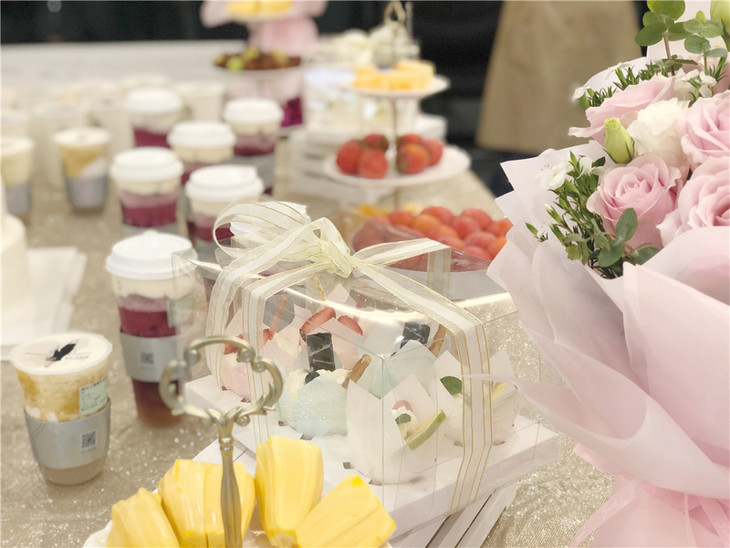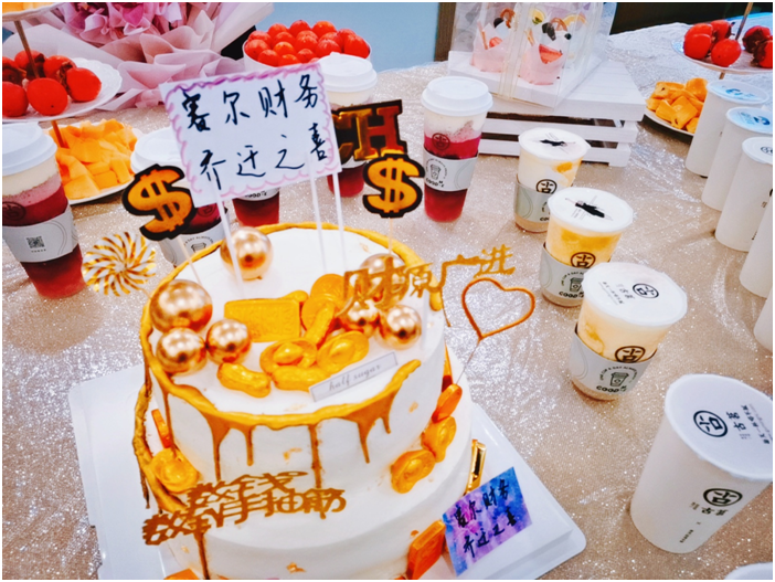 10月27日下午,賽爾大樓25層財(cái)務(wù)會(huì)議室里,正熱火朝天地舉行著喬遷小party。C位留給白金色雙層大蛋糕,用幾十杯不同口味的奶茶和果飲圍著蛋糕擺出完美的愛心,另有漂亮淡雅的溫柔系粉色鮮花、綁著金絲帶的甜品禮盒助陣,再添上各色水果,看得人眼花繚亂。彩姐和吳穎姐一起切完蛋糕后,小伙伴們正式開啟嗨吃模式。
