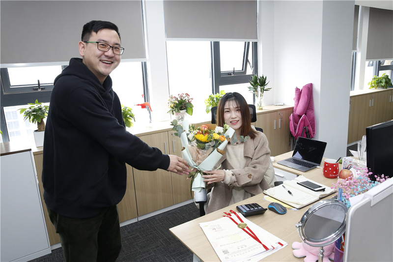 在女神節這個特殊的日子里,綠時為每一位女生都送上了最真摯的祝福。隨著公司里響起了《我是女生》的活潑旋律,男生們拿著鮮花出現了!