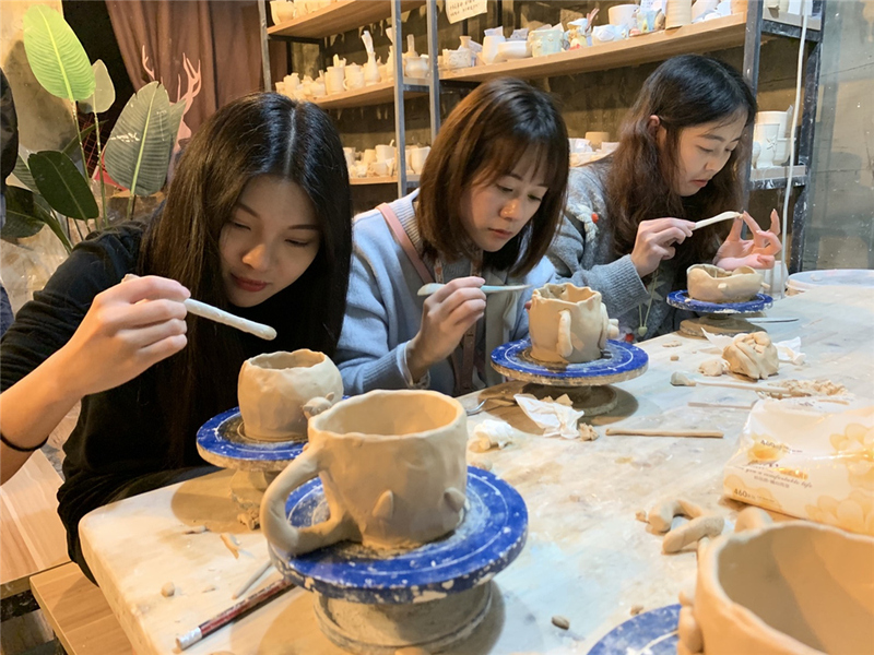當(dāng)天中午,大家約在鼓樓的“桃妝”吃飯,這是一家老網(wǎng)紅,菜色和環(huán)境都很不錯(cuò)。最有特色的就是桃花酒啦,很值得一品,我們豪氣地一人來了一碗,干杯!午餐結(jié)束后則是最期待的陶藝DIY時(shí)間。大家各自選好想要制作的作品,開始埋頭認(rèn)真制作。大家都是第一次做陶藝,手藝生疏得很,還好有老師指點(diǎn),做出來的作品也都富有特色。