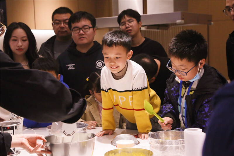 大伙兒滿懷期待,早早地到達集合地。在蛋糕師一輪耐心的實操教學(xué)后,大家迫不及待來到廚臺前進入DIY環(huán)節(jié)!平時在行行代碼間修正bug的IT小哥哥們,穿上圍裙后搖身成為米其林糕點師。60克牛奶,60克白糖,60克低粉,6個雞蛋…若干材料混合在一起,變化為面包坯原料。蛋糕制作中最重要也是最難的步驟是將蛋黃制作成蛋糊的乳化過程,但這也難不倒技術(shù)部的小哥哥小姐姐們,發(fā)揮理工科對精確性的把握,打蛋機手法和對時間的把控令人嘖嘖稱奇,不一會兒蛋糊就變得濃郁綿密,指導(dǎo)老師也對大家的成果贊不絕口。烤箱上下175度,烘培20分鐘,一塊塊香噴噴的面包坯就烤制完成,金黃色的蛋糕早就讓小朋友們都垂涎三尺。最后,奶油和水果粒組合定型,蛋糕完成。