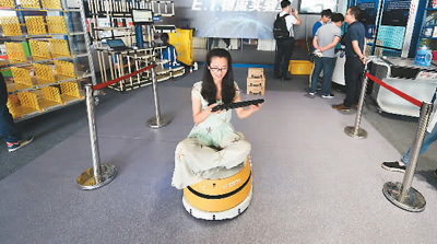 2016年6月13日,浙江杭州舉辦2016全球智慧物流峰會,觀眾在展區體驗配送機器人。