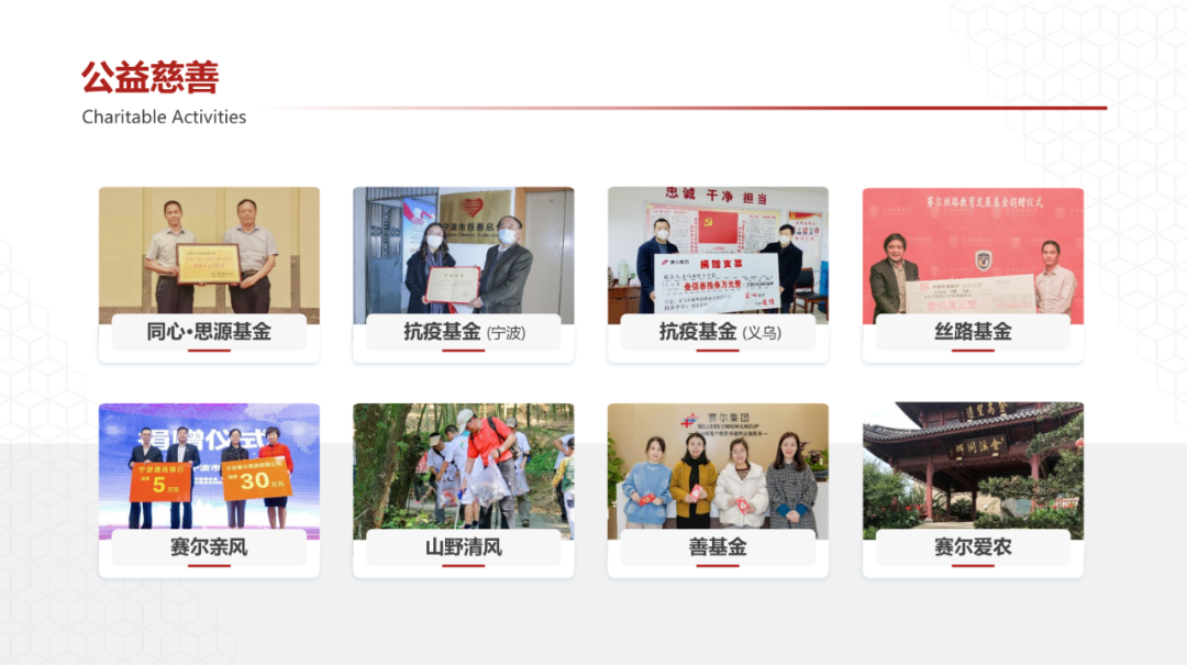 持續(xù)推進(jìn)企業(yè)高質(zhì)量發(fā)展,量力而行地投身社會公益事業(yè),始終是賽爾集團(tuán)企業(yè)文化的不變堅持。賽爾集團(tuán)成立25年以來,已累計捐贈現(xiàn)金超過3000萬元,涉及扶貧濟(jì)困、助學(xué)支教、新農(nóng)村建設(shè)、社會公益服務(wù)等領(lǐng)域,搭建了“山野清風(fēng)”環(huán)境保護(hù)、“賽爾親風(fēng)”關(guān)愛失獨(dú)老人和星寶自閉癥家庭、“絲路基金”國際文化交流、“賽爾愛農(nóng)”支持新農(nóng)村建設(shè)等內(nèi)容為主體的企業(yè)公益慈善體系。