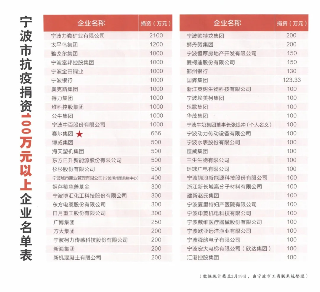 2020年,向?qū)幉ù壬瓶倳栀?zèng)10萬元,資助寧波星寶自閉癥家庭支援中心。2月,徐平炬?zhèn)€人捐贈(zèng)30萬元用于抗擊新冠疫情。2月,集團(tuán)捐贈(zèng)666萬元支持寧波市、義烏市(兩地各333萬元)抗擊新冠疫情。12月,徐平炬向浙江省民建紅十字思源幫扶救助基金捐款200萬元。