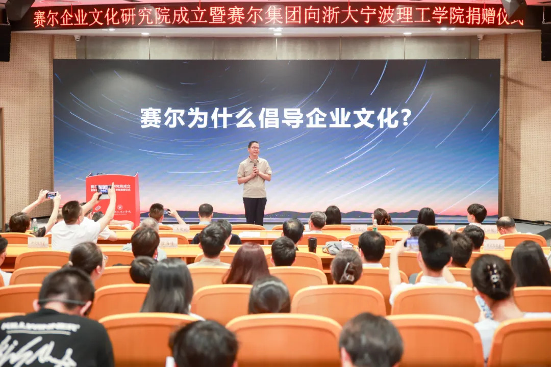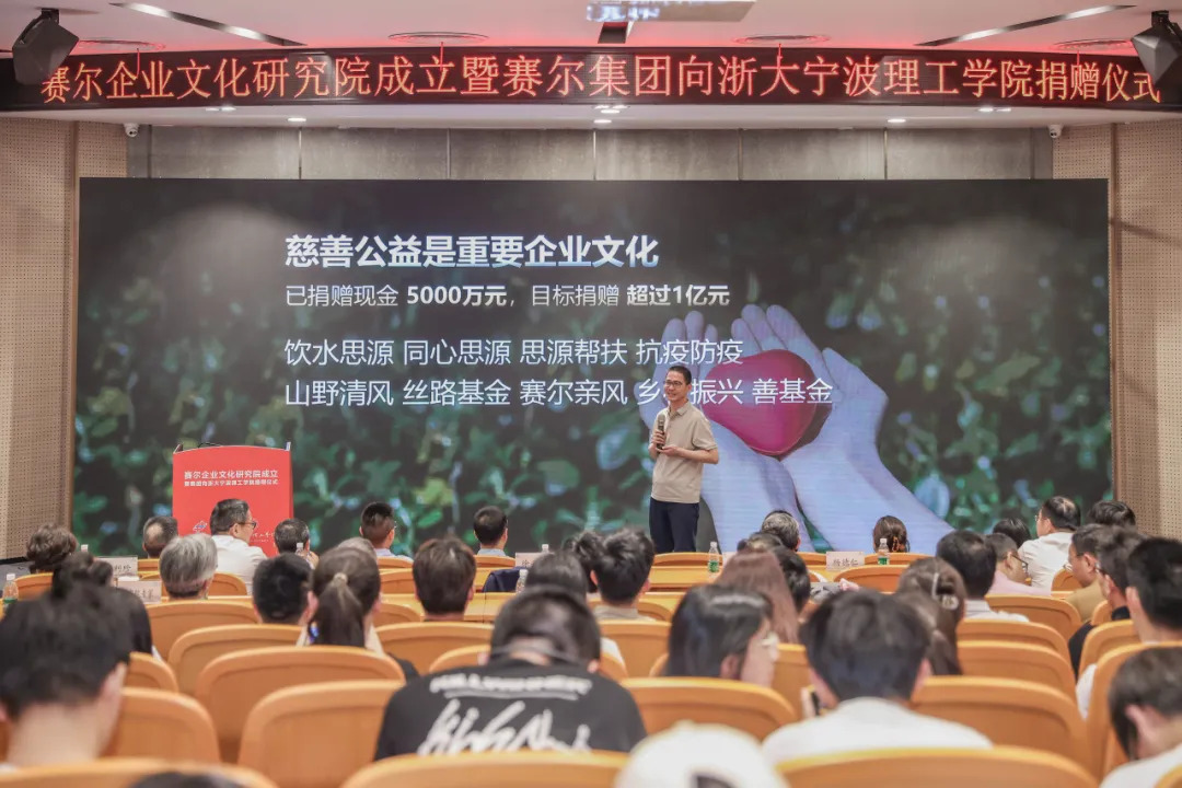賽爾集團董事長徐平炬作“賽爾為什么提倡企業文化”的主題分享。他表示,去年我們在寧波大學揭牌成立“賽爾貿易數字化研究院”,今天我們又在浙大寧波理工學院揭牌成立“賽爾企業文化研究院”,將聚焦企業發展中的數字課題和文化命題開展研究,推動產業前瞻性洞察和企業實踐應用的雙向賦能。今天在浙大寧波理工學院落地捐贈項目,并將賽爾文化研究院成立揭牌儀式安排在這里,是因為大學有著豐富的研究型人才資源和活躍優秀的校友資源,理工學院優秀校友們也在我們集團擔任著重要職務,并且理工學院對校友會的工作非常重視,大學本身就是最好的公益載體,非常高興校企雙方達成企業文化研究合作。他表示,賽爾集團是一家創新驅動的日用消費品進出口集團。成立27年來,集團經歷了不同發展階段,先后從銷售浴室用品和家庭用品的野蠻生長者,到提供日用消費品一站式貿易服務的行業探索者,再到構建外貿B2B、跨境電商和外貿生態圈三條賽道的外貿新物種,未來計劃成為全業態、全模式、全品類、全球化、全渠道、全球化發展的全球布局者。