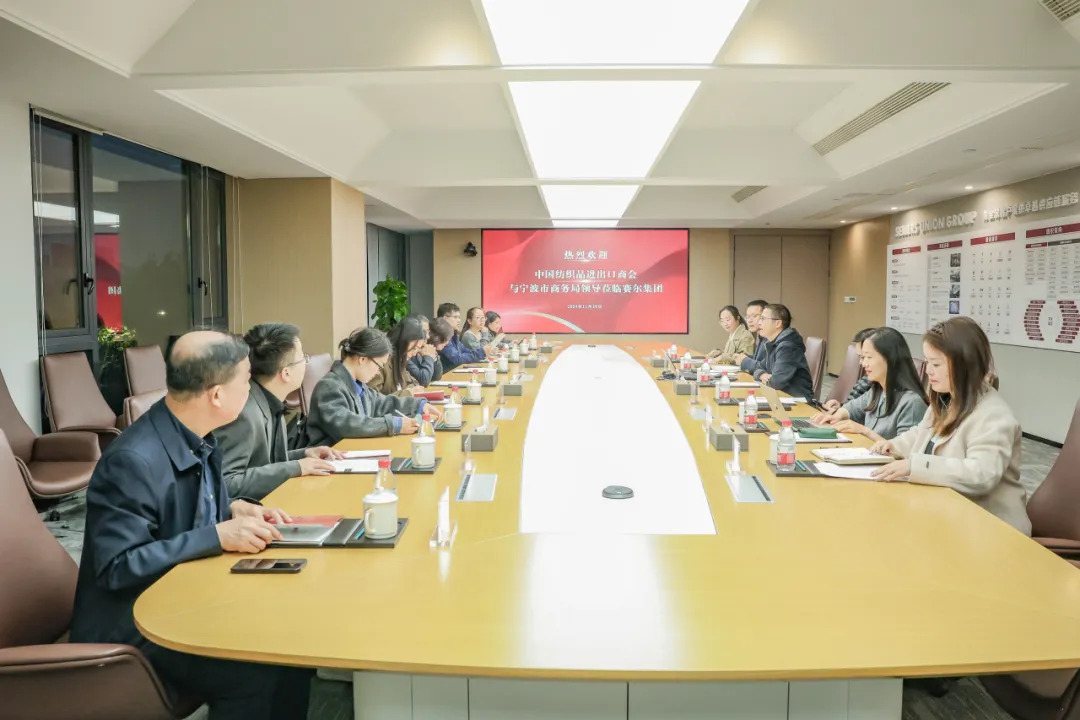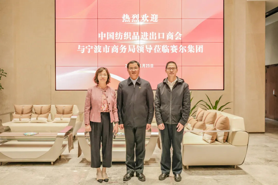 11月25日下午,中國紡織品進(jìn)出口商會曹甲昌會長、會員部副主任苗青芳等一行來賽爾集團(tuán)走訪調(diào)研。寧波市商務(wù)局黨組副書記、副局長、二級巡視員韓雋、市商務(wù)局貿(mào)促處處長張陽松、貿(mào)促處副處長馬建萍等陪同調(diào)研,賽爾集團(tuán)董事長徐平炬、副董事長聯(lián)席總裁陳勇珍、總裁助理馬科成、集團(tuán)行政副總經(jīng)理方芳、優(yōu)勝公司副總經(jīng)理張怡和業(yè)務(wù)副總監(jiān)胡穎等熱情接待。